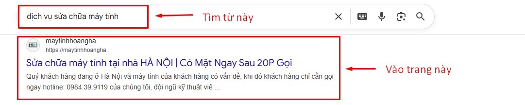 - Bước 2: Tìm từ trên xuống dưới sẽ thấy trang https://maytinhhoangha.***/***-ha-noi/ thì bấm vào đó
